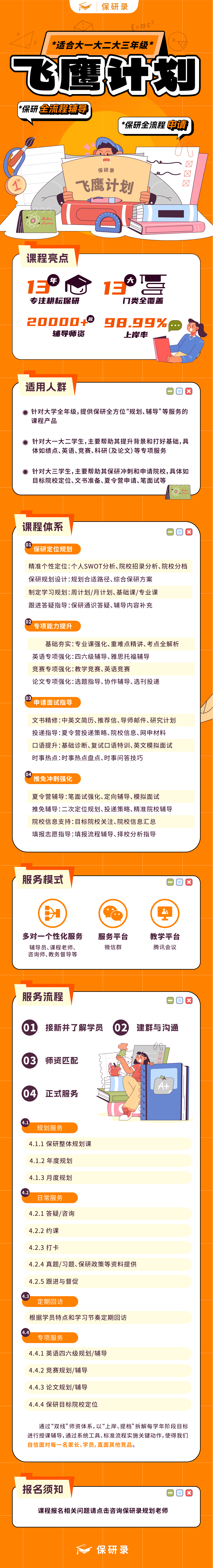 “⻜鹰计划 - 保研全流程”是针对⼤学全年级,提供保研全⽅位“规划、辅导”等服务的课程产品。